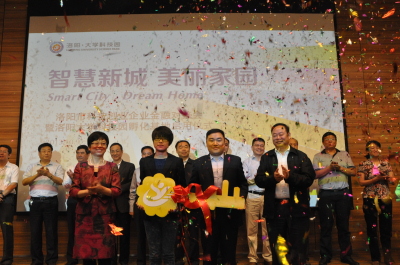 河南省科技廳領(lǐng)導(dǎo)、洛陽(yáng)市領(lǐng)導(dǎo)共同為入駐園企業(yè)代表頒發(fā)智慧金鑰匙,標(biāo)志著洛陽(yáng)大學(xué)科技園新落成孵化基地正式啟用。